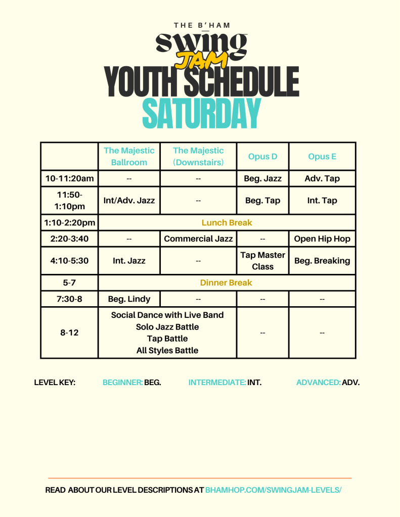 Youth, Beginner, Intermediate, Advanced, and Master Classes will be offered. Please read the descriptions on our Level Descriptions page so you know what classes you should attend. Reach out to bham.hop@gmail.com if you don’t know what level you are and we will assist you.